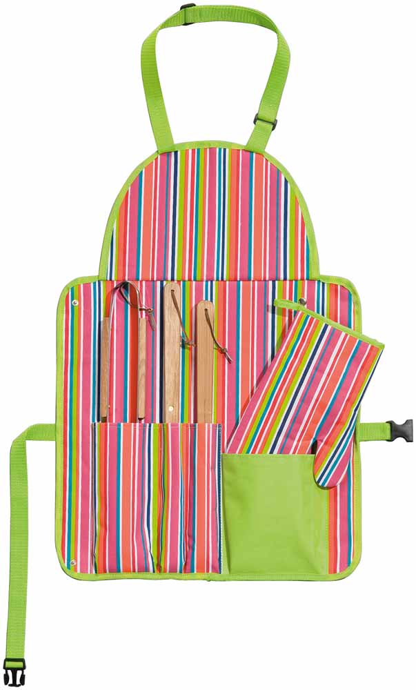 Performance: apron and in it's pockets: a spatula, fork, tongs and glove